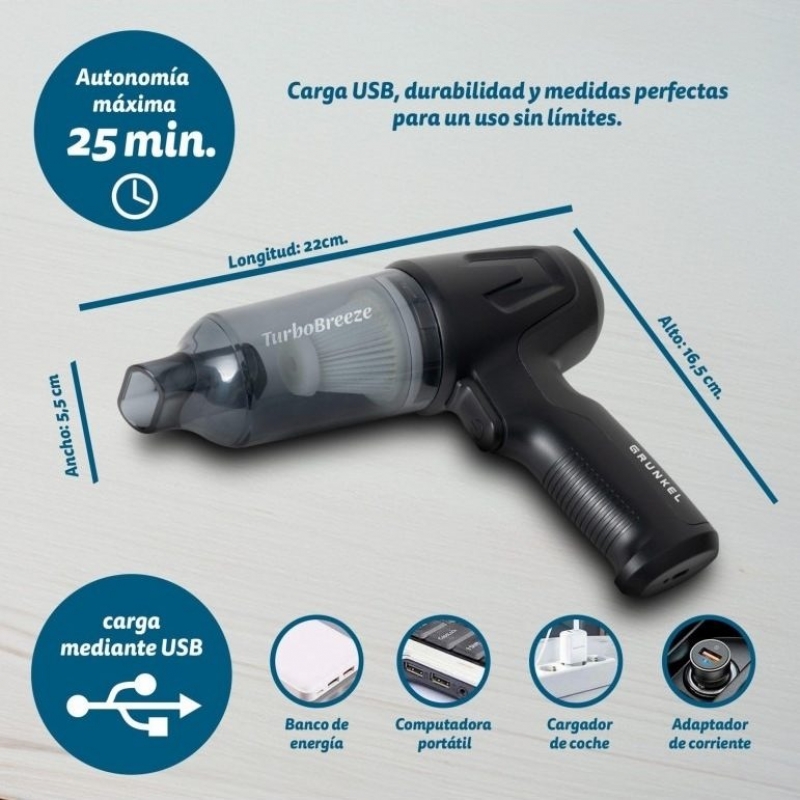 Equipada con una batería de 2000 mAh, ofrece hasta 25 minutos de autonomía, suficiente para realizar limpiezas rápidas y eficaces sin cables. Además, su carga mediante USB permite recargarla cómodamente en casa, en el coche o incluso con una batería externa.