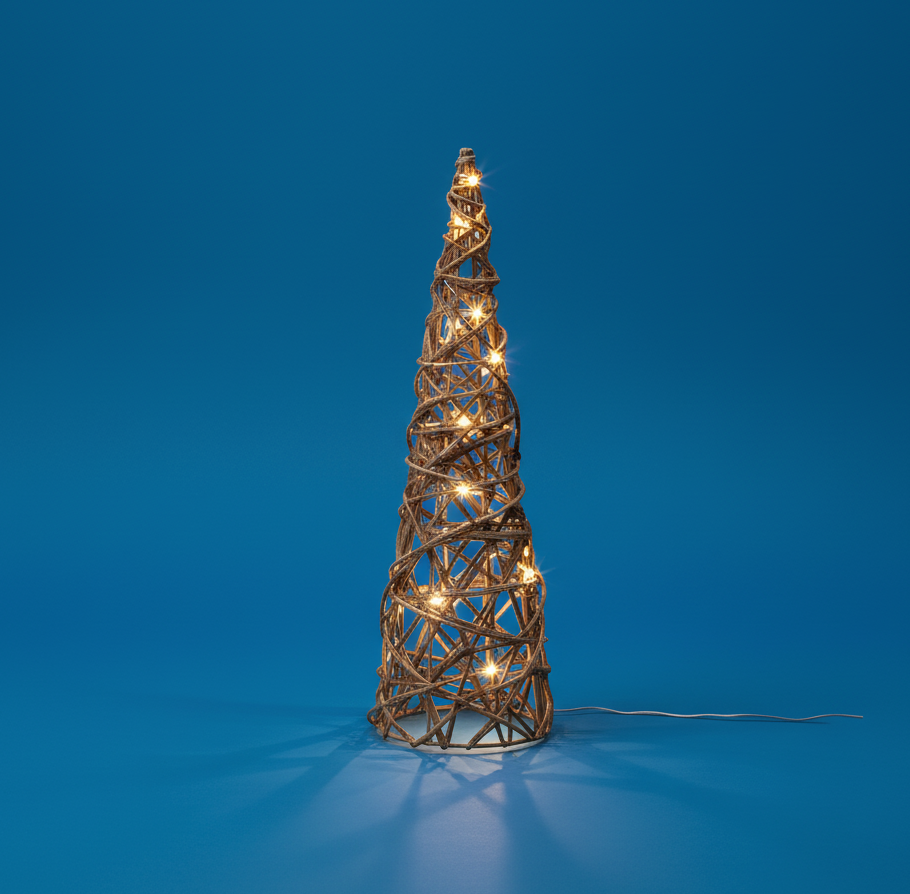 El Cono Luminoso Dorado 50cm con ratán y 20 leds 3xAA es un elegante adorno decorativo perfecto para iluminar tu hogar en Navidad. Fabricado con ratán trenzado, ofrece un diseño natural y sofisticado que combina con cualquier estilo. Funciona con 3 pilas AA (no incluidas) e incluye modo flash y temporizador de 6h ON / 18h OFF para un uso cómodo y eficiente. Con bajo consumo (1.2W) y luz cálida, crea un ambiente acogedor y festivo tanto en interiores como en escaparates o mesas decorativas.