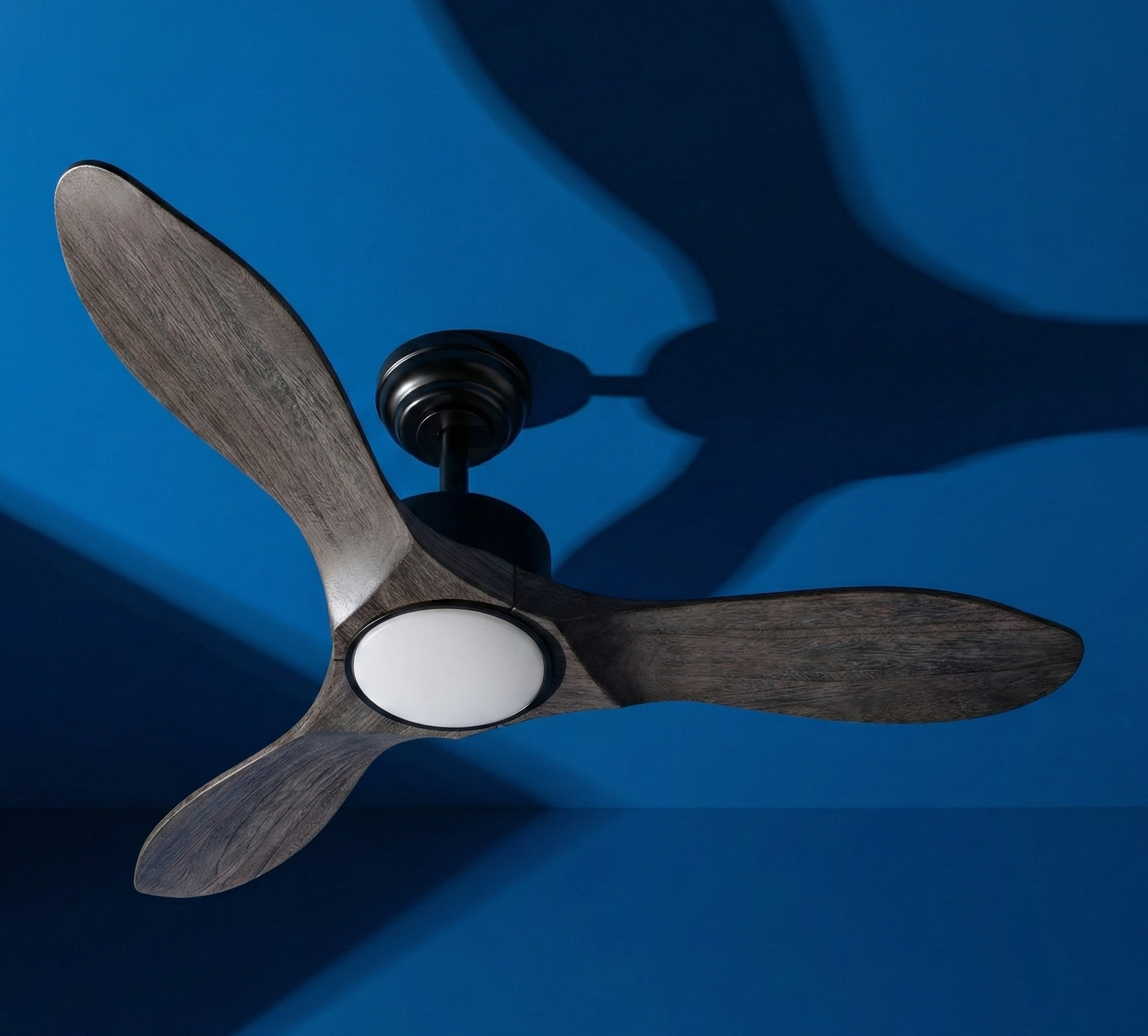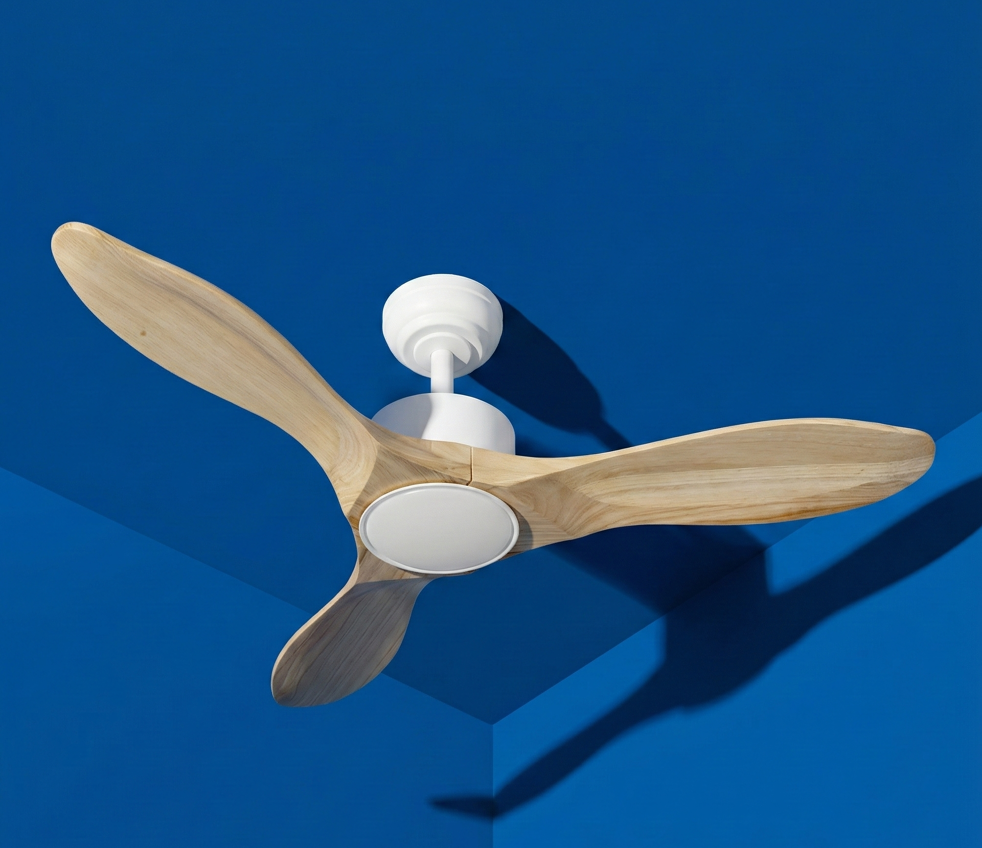 Ventilador de techo Segre de 3 aspas de madera y motor DC silencioso, con 6 velocidades, función verano/invierno y temporizador. Incluye luz LED regulable en blanco cálido, frío y natural, con 2424 lúmenes y potencia de 24 W. Diseño elegante disponible en blanco/haya o negro/roble, ideal para estancias de hasta 107 cm de diámetro.